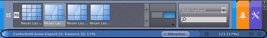 zu den jeweiligen Statusanzeigen wechseln. Zwischen ihnen werden folgende Informationen angezeigt: ID des laufenden Exportvorgangs / Gesamtzahl der Exportvorgänge (Exportfortschritt für alle Vorgänge). Zum Abbrechen des laufenden Exports klicken Sie auf .Nach Abschluss des Exportvorgangs wird das hervorgehobene Aufnahmefragment im Format .mkv im Verzeichnis gespeichert (klicken Sie zum Öffnen dieses Ordners auf