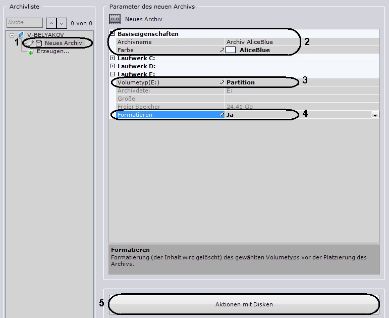 Um ein Archiv in Partitionsform anzulegen, sind folgende Aktionen durchzuführen: