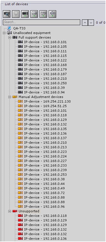 Unallocated Servers (that is, servers that do not belong to any Axxon Domain) and IP devices are shown in the system after you perform a device search. To start a search, click the