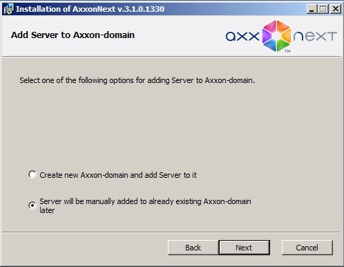 - Installing the Axxon Next software package with the Server and Client configuration type on the other servers of the future Axxon Domain, without adding them to the Axxon Domain (see also step 8 of the instructions in the section Installation).