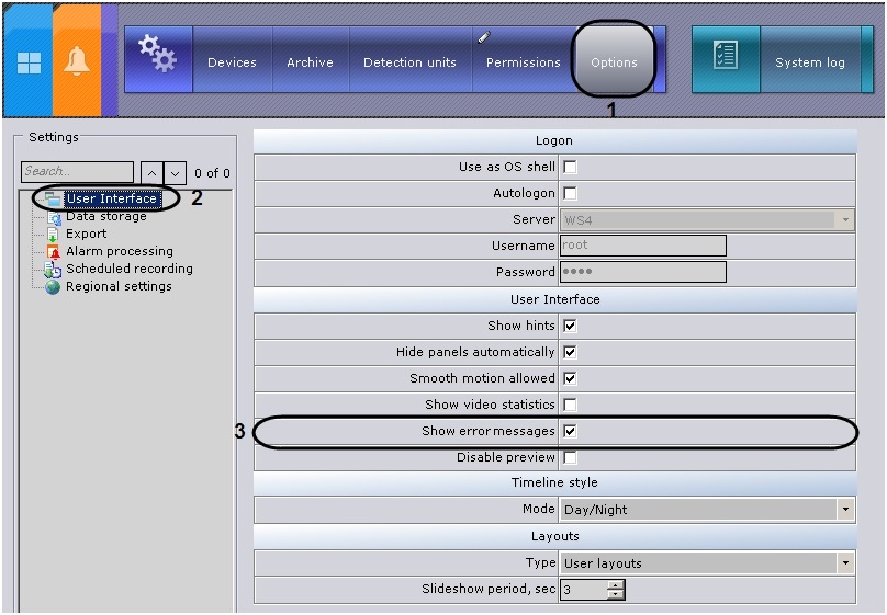 By default, messages about system errors which have occurred are displayed in real time in the Layouts and Alarms tabs of the Axxon Next software package.