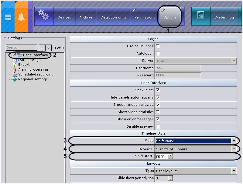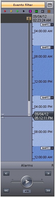 If the Shift work style is set, the timeline will be displayed in alternately colored segments (depending on the number of shifts set per day and the beginning of the first shift). Each segment contains an identification number for each shift. In Axxon Next, the user can choose 3 types of shifts (three 8-hour shifts, two 12-hour shifts, or one 24-hour shift).