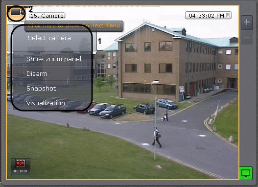To bring up the viewing tile context menu (1), left-click the video camera icon in the upper left-hand corner of the tile (2).