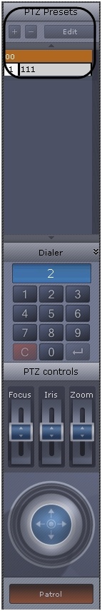 The presets list created for a selected video camera is displayed in the upper part of the PTZ control panel.