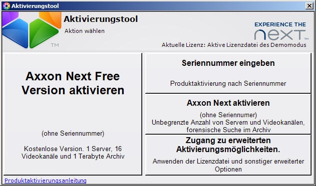 Die Aktivierung der Lizenz für die Softwareplattform Axxon Next erfolgt mit Hilfe eines Produktaktivierungstools.