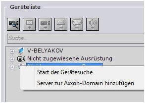 Wenn der Server bei den Suchergebnissen erscheint, empfiehlt sich folgende Vorgehensweise, um ihn zur Axxon-Domain hinzuzufügen:
