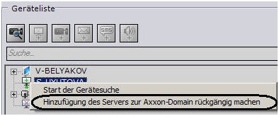 Sobald der Server zur Verfügung steht, wird er der Axxon-Domain hinzugefügt. Um die Hinzufügung des Servers zur Axxon-Domain zu beenden, müssen Sie im Kontextmenü (aufzurufen durch einen Klick mit der rechten Maustaste auf den Servernamen) die Option Hinzufügung des Servers zur Axxon-Domain abbrechen wählen.