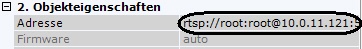 In einigen Fällen kann sich das Adressenformat unterscheiden. Zum Beispiel kann die Adresse um einen Anmeldenamen und ein Passwort für die Verbindung zur Videokamera erweitert werden.