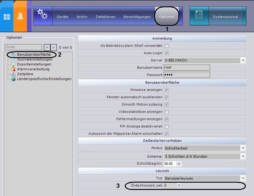 Der Diashowsmodus ist eine zyklische Layout-Umschaltung mit dem vorgegebenen Zeitintervall. Die Diashow wird über das Kontextmenü der Layoutleiste gestartet.