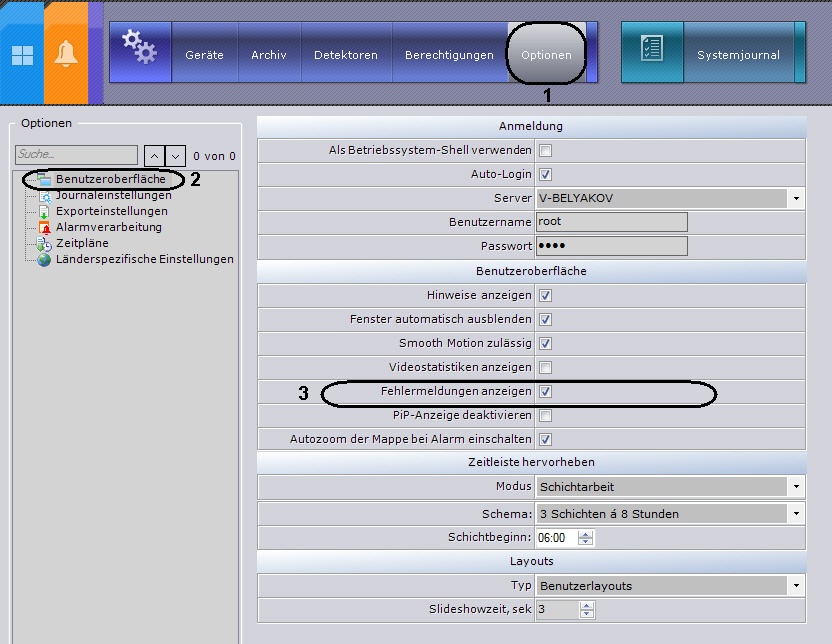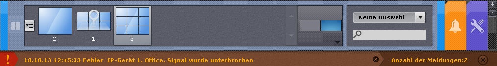 In der Voreinstellung werden Mitteilungen über aufgetretene Systemfehler in Echtzeit in den Registerkarten Layouts und Alarme der Softwareplatttform Axxon Next ausgegeben.