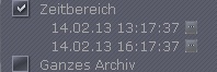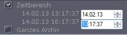 Den sichtbaren Teil der Zeitleiste können Sie verändern, indem Sie darin navigieren oder durch unmittelbare Eingabe eines Intervalls. Zur Angabe eines Anfangs- und Endpunkts der Suche dienen die Schaltflächen (vlg. Navigieren mithilfe der Zeitleiste).