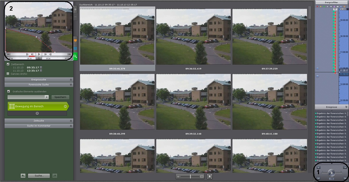 2. Starten Sie die Wiedergabe des Fragments im Kamerafenster (2) mit dem Wiedergabe-Feld (1).
