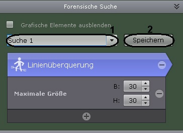 Um eine Suchanfrage zu speichern, geben Sie deren Namen ein (1), und klicken Sie auf Speichern (2). Danach ist die Registerkarte dieser Suchanfrage in der rechten unteren Ecke des Videoüberwachungsfenster im Echtzeit- und Archivmodus verfügbar (vgl. Umschalten auf die Ergebnisse der gespeicherten Suchanfrage).