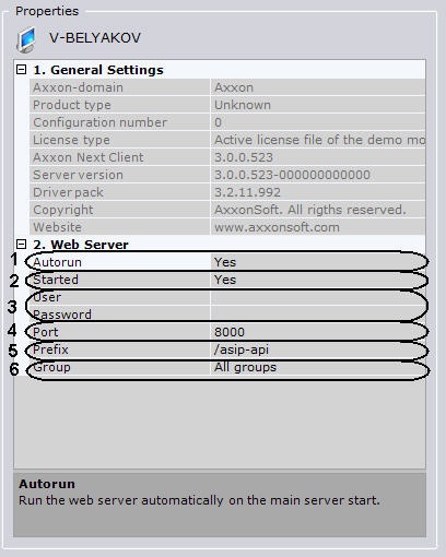 2. If you want for the web server to start at the same time as the Server in the Axxon Next software package, set the Autorun setting to Yes (1). The default value is Yes.