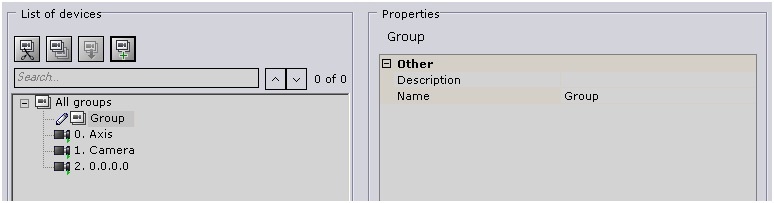 The All groups object, which includes all video cameras created in the system, is accessible by default. It is impossible to delete this object. It is also impossible to delete video cameras from this group