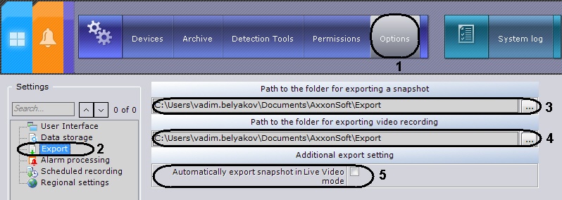 In the Path for snapshot export (3) and Path for video export fields (4), enter the full path to the folders where exported files are to be saved. To do this, click the button