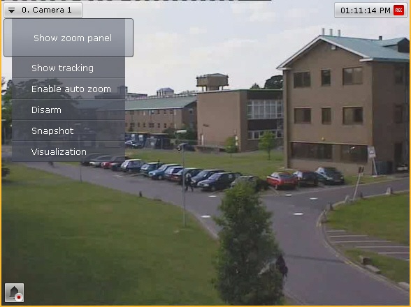 To bring up the viewing tile context menu (1), left-click the video camera icon in the upper left-hand corner of the tile (2).
