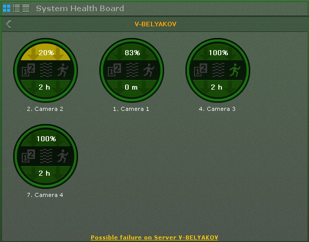 Health Boards display the status of selected system servers and connected cameras.