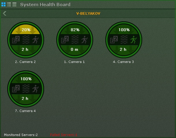 Information about the status of cameras can be displayed in three ways, chosen via the buttons in the upper-left corner of the board: