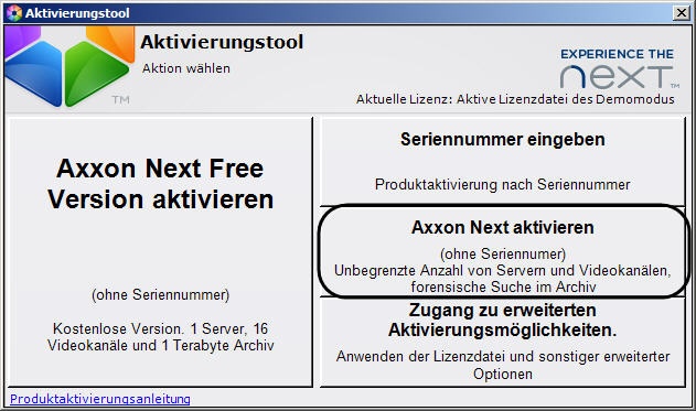 Zur Aktivierung der Lizenz Axxon Next bei fehlender Seriennummer sind folgende Schritte durchzuführen: