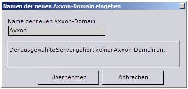 Es erscheint das Fenster Namen der neuen Axxon-Domain eingeben. Geben Sie im Feld Name der neuen Axxon-Domain den Namen der Axxon-Domain ein, um eine neue PC-Gruppe auf Basis des ausgewählten Servers zu erstellen, und klicken Sie auf Übernehmen.