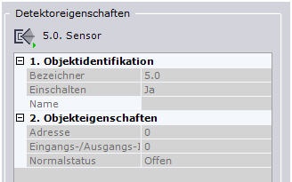 Die Einrichtung des Sensors muss in der Registerkarte Geräte durchgeführt werden (vgl. Abschnitt Das Objekt Sensor): Das Feld Detektoreigenschaften in der Registerkarte Detektoren übernimmt die in der Registerkarte Geräte vorgenommenen Einstellungen und kann selbst nicht bearbeitet werden.