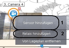 Es besteht die Möglichkeit, die Symoble des Sensors und des Relais vom Videokamerasymbol zu lösen. Dazu schieben Sie sie davon. Danach erfolgt das Verschieben der Sensor- und Relaissymbole unabhängig vom Videokamerasymbol.