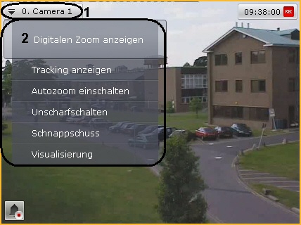 Zum Aufruf des Kontextmenüs des Kamerafensters (1) müssen Sie mit der linken Maustaste auf das Kamerasymbol in der linken oberen Ecke dieses Fensters klicken (2).