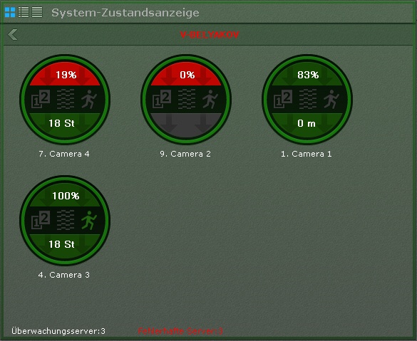 Informationen zum Zustand der Videokameras können auf drei Arten angezeigt werden, zwischen denen sich mit den Schaltflächen in der oberen linken Ecke der Leiste umschalten lässt: