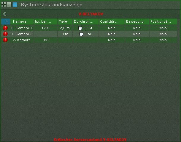 3. Kritisch - kein Signal von der Kamera oder Stream-Geschwindigkeit unter 20%. Die Farbe der Kamera im Diagramm und in der Tabelle ist rot.