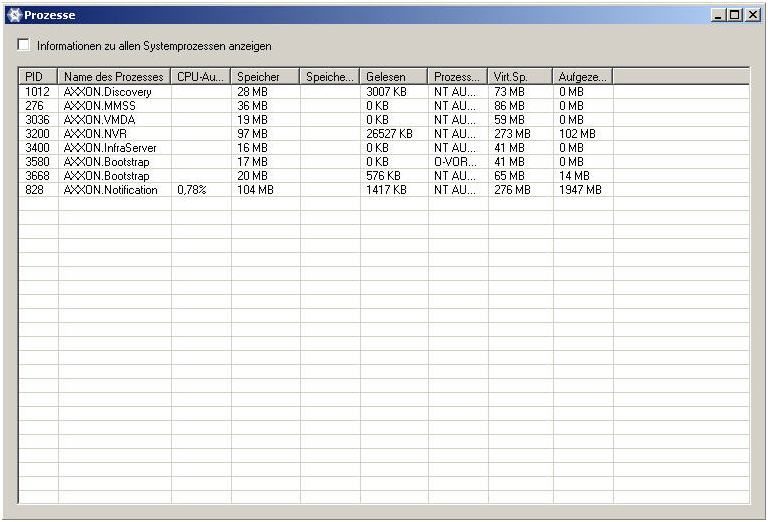 Bei aktivierter Option Informationen zu allen Systemprozessen anzeigen können Sie sich alle auf dem Computer ausgeführten Prozesse anschaue.