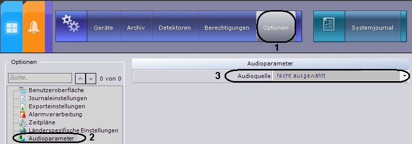 Wählen Sie im Feld Audioquelle ein Systemgerät, dass als Tonsignalquelle für die Wiedergabe durch den Lautsprecher der Kamera dienen soll (3).