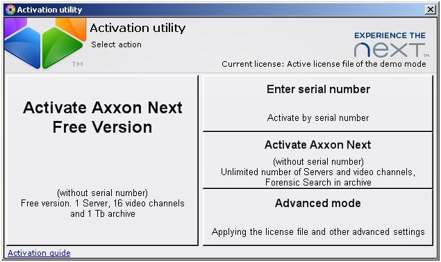 License activation for the Axxon Next software package is carried out through the product activation utility.