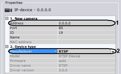 In the Address field, enter the address of the RTSP broadcast (1). In general form, the address is as follows: rtsp://<IP address of RTSP server>:<Port on RTSP server>/<Path>.