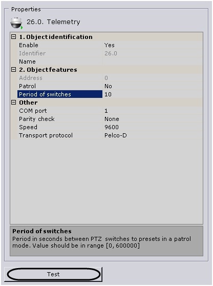 To check the functioning of the PTZ device, click the Test button. If the PTZ device is configured correctly, it will turn one step and return to its original position.