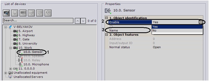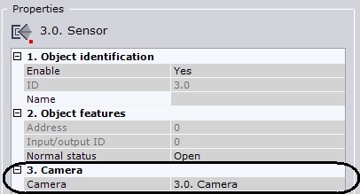 If a sensor is part of an IP server, the sensor settings allow choosing  the video camera of the IP server it will be matched to. When you do this, the sensor object will appear as the child object of the specified camera in the object tree.