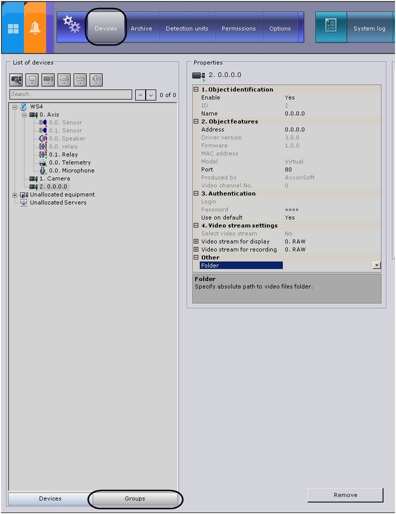 Video camera groups are configured through the interface using the Devices tab (under Settings). To configure device groups, you must have the appropriate permissions to configure devices.