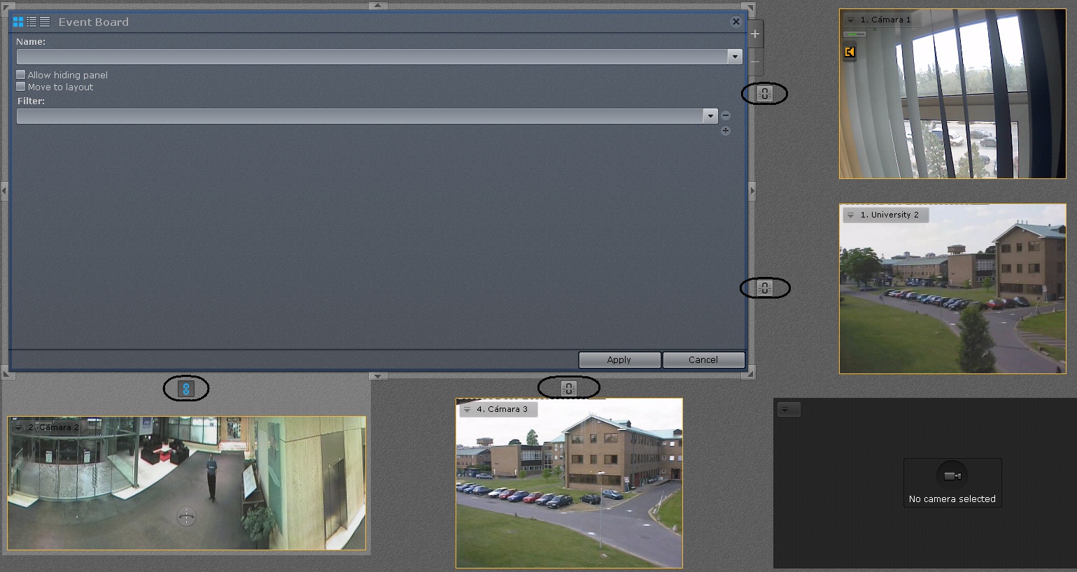 Links are set by placing items in neighboring cells. A single information board can be linked with multiple cameras. Boards cannot be linked with each other, nor can viewing tiles be linked with each other.