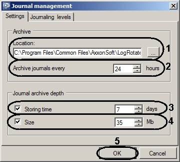 Configuring a log archive is carried out in the Settings tab of the log management utility.