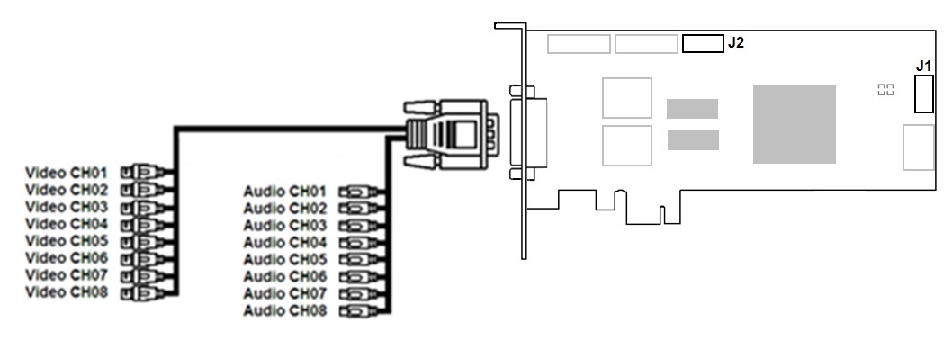 VRC7008L video capture card has a DVI pin. DVI /BNC interface cable is used for simultaneous connection of up to 8 cameras and 8 sound sources to external DVI pin of VRC7008L video capture card. DI/DO card is connected to the J1 pin. J2 pin corresponds to analog video out