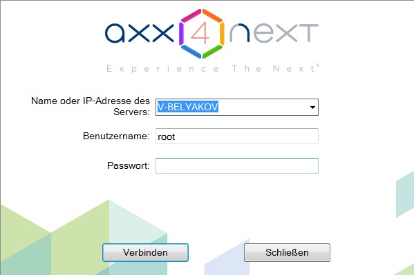 Nach Durchführung einer der oben genannten Aktionen erscheint das Autorisierungsfenster. Zum Beenden der Softwareplattform Axxon Next (vollständiges Herunterfahren des Client) müssen Sie auf Schließen klicken.