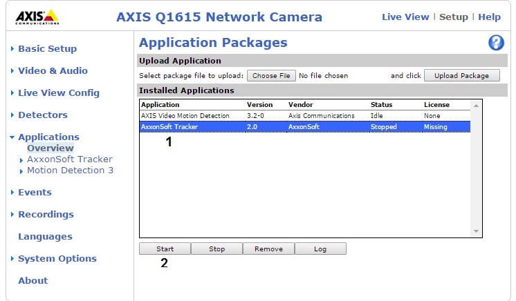 Wählen Sie die ACAP Anwendung aus (3) und klicken Sie auf "Paket hochladen" (4).