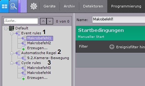 - Ereignismakros (1). Diese Makros werden bei Erfassung definierter Ereignisse oder manuell vom Bediener ausgeführt. Bei einer Auslösung werden die Aktionen im Makro einmal ausgeführt.
