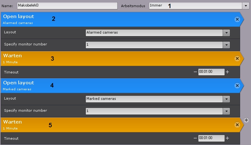 Der Zyklus besteht aus einem Wechsel des Layouts mit Alarmkameras (2) und des Layouts mit markierten Kameras (4). Intervall - 1 Minute (3, 5).