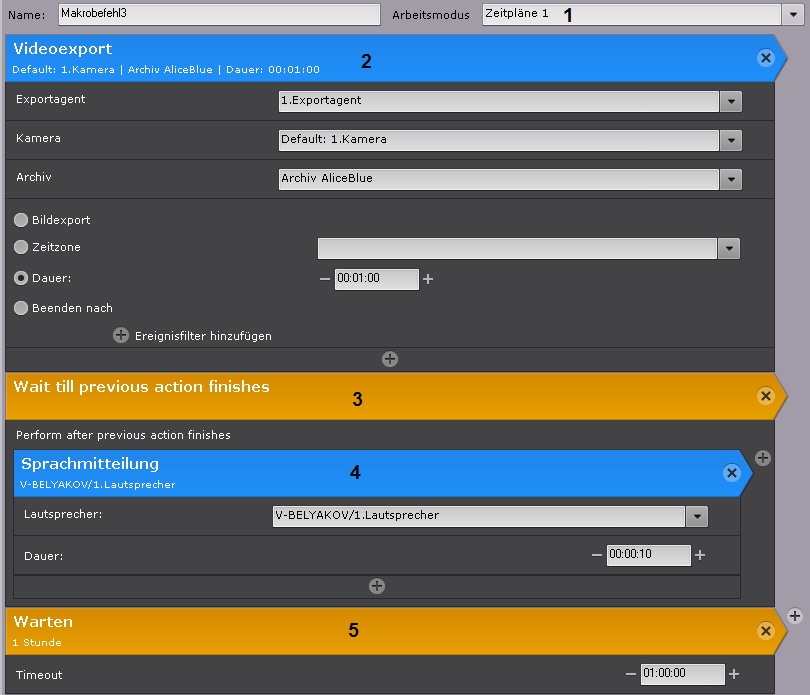 Stündlich (5) erfolgt ein Videoexport aus Kamera 1 (2). Nach Abschluss des Exports (3) wird eine Sprachmitteilung abgespielt (4).