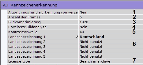 - Um die Zahlen bei scharfen Winkeln in Bezug auf die Kamera zu erkennen, wählen Sie im Feld Algorithmus fur die Erkennung von verzerrten Kennzeichen (1) die Option Ja.