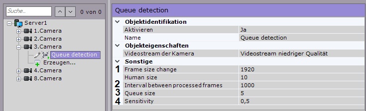 - Geben Sie die Empfindlichkeit des Erkennungstools in Standardeinheiten von 0 bis 1 (4) an. Je höher die Empfindlichkeit, desto geringer sind die vom Warteschlangenerkennungsalgorithmus analysierten Störungen. Je niedriger wiederum die Empfindlichkeit ist, umso mehr Veränderungen in der Szene werden vom Warteschlangenerkennungs-Tool verarbeitet.