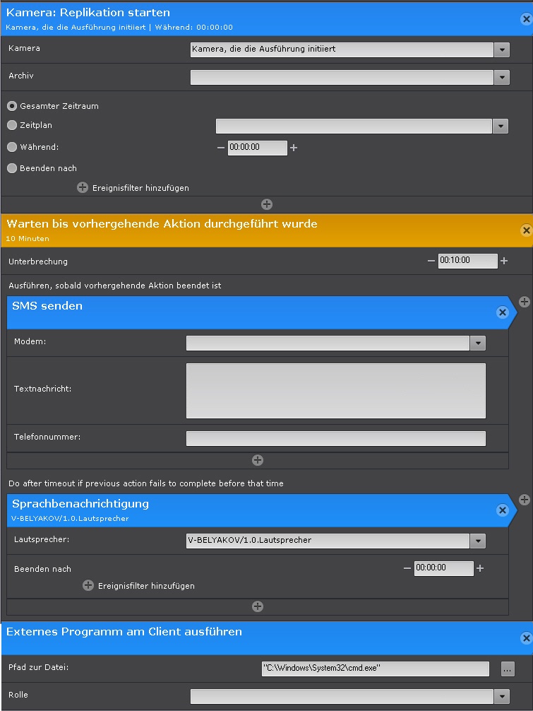 Beispiel: In diesem Makrobefehl startet die Replikation (1) und das Programm auf dem Client (5) zur gleichen Zeit. Wenn die Replikation innerhalb von 10 Minuten abgeschlossen ist (2), wird eine SMS-Nachricht (3) gesendet. Andernfalls ertönt ein akustisches Signal (4).
