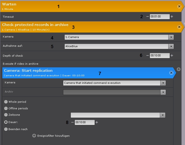 Der Screenshot zeigt Einstellungen, die das System einmal pro Minute (2) nach geschützten Aufnahmen im Kamera 1 (4) Archiv AliceBlue (5) innerhalb des [Startzeit der frühesten Aufnahme in Videomaterial + 10 Minuten] Zeitintervalls (6 ) scannen lassen. Wenn dieses Intervall geschützte Aufnahmen enthält, wird die Vervielfältigung gestartet, um alle geschützten Aufnahmen, die in das [Anfangszeit der frühesten Aufnahme in Videomaterial; Startzeit der frühesten Aufnahme in Videomaterial + 10 Minuten] (8) Intervall zur Vervielfältigung festgelegten Videomaterials zu kopieren.