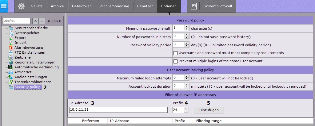 - Geben Sie in der Gruppe IP-Adressenfilter die IP-Adresse (3) und die Subnetzmaske (4) ein, um den Adressbereich festzulegen, von dem aus eine Verbindung zugelassen wird.